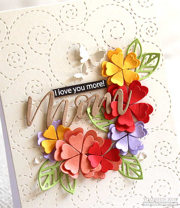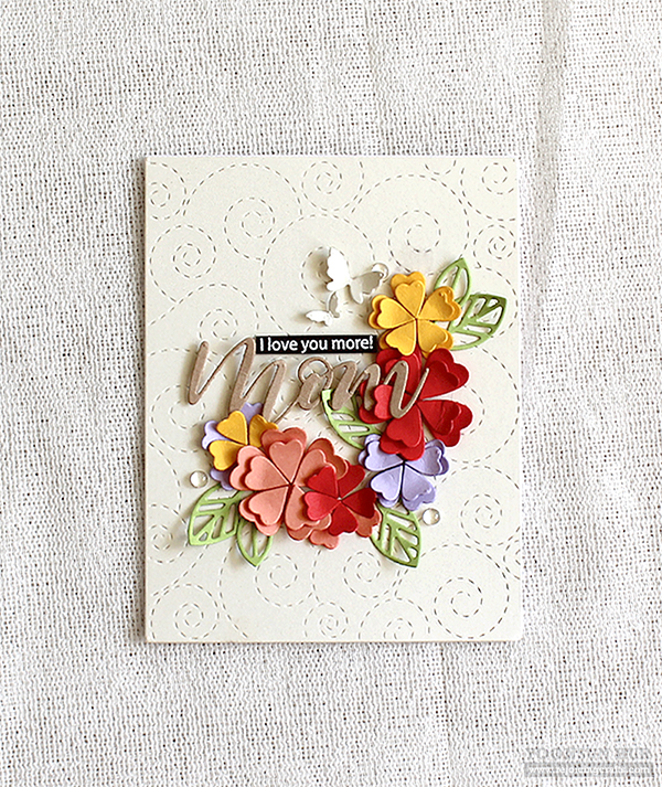 I lightly curled up all flower petals using bamboo chopstick, and then made 2 layering flowers as shown in the picture. I mounted the Stitched Whirl Panel on white card base using Glue Dots Permanent Tape Runner first, and then adhered flowers, leaves, butterflies, kraft script mom over the panel using foam tape.
