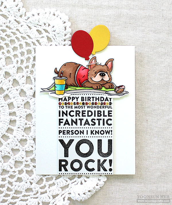 I stamped a cute dog from the Chillin Frenchies Set on white card stock using Memento Tuxedo Black dye ink, coloured it with alcohol markers, then die cut it with matching die. For those two balloons hanging on a dog’s ear, I used the Big Birthday Greetings Die Set.