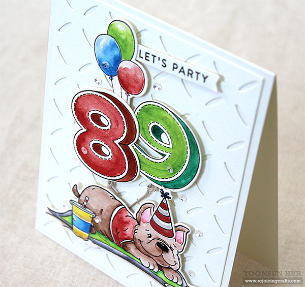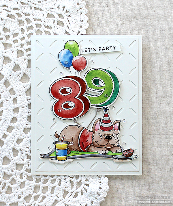 My friend’s grandma, Margaret, will be 89 next Saturday. She loves her old dog very much so my friend wanted me to make her birthday card with dog. You know what? The Chillin Frenchies Set is furrrrr-fect for Margaret’s birthday card! I stamped a lovely dog (from the Chillin Frenchies Set), numbers & balloons (from the Birthday Numbers Set) on watercolour paper using VersaFine Onyx Black, coloured them with Hero Arts Watercolor Wheel & some of Distress markers, and then die cut them with matching dies.