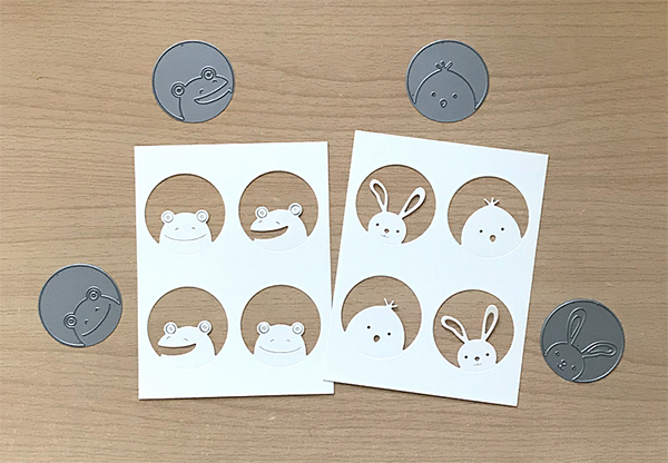 I die cut a 4.25″ x 5.5″ rectangle panel from white card stock using the Basic Rectangles Die Set first, and then made a couple of peeking animal window panels (as shown in the picture) using the Peeking Frog, Talking Frog, Bunny and Chick Dies.
