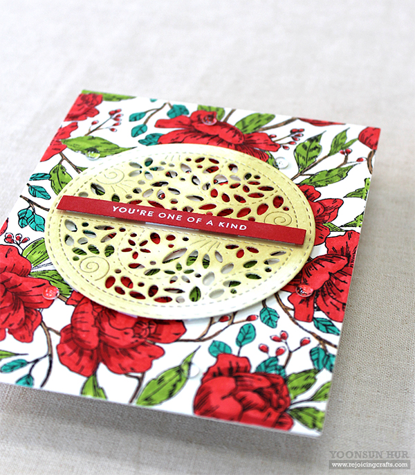 I stamped the Pretty Peonies Background on a 4.25″ x 5.5″ white paper panel using Memento Tuxedo Black dye ink, then coloured the stamped images with Altenew Artist Markers – red & green is my most favourite colour combo to flowers. :D