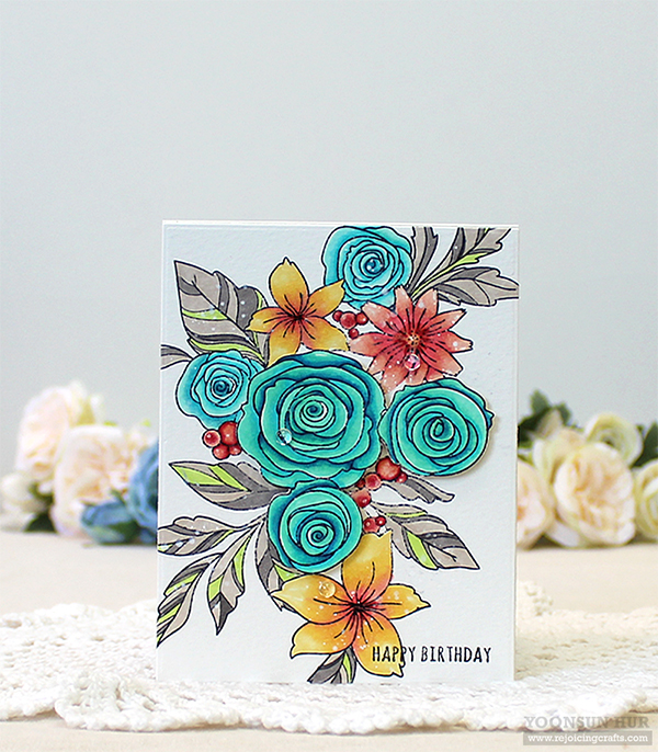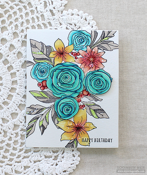 I coloured all stamped images with Altenew Artist Markers. I usually choose red colour to rose and green to leaves but I just chose blue roses & grey leaves in this card! :D