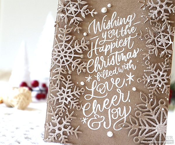 I started by heat embossing the sentiment from the Holiday Greetings Mix 1 set in white onto the centre of kraft card front. I then die cut different sized snowflakes from kraft card stock using the Marie, Lea, Grace, Rina and Kate Snowflake dies – I wanted to make tone-on-tone winter holiday patterned card.