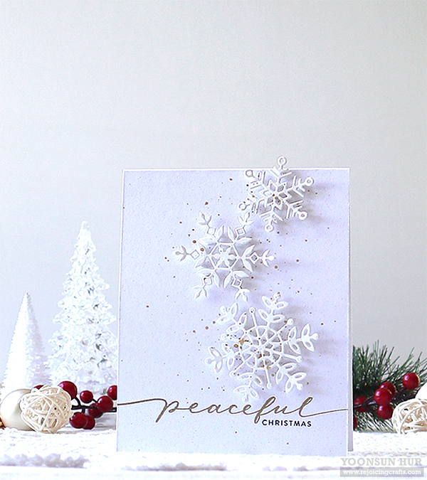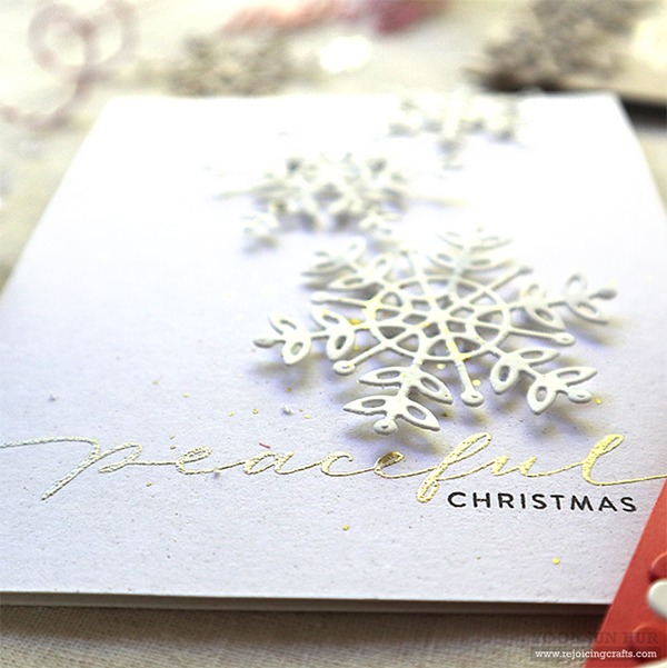 Here is another tone-on-tone background card with beautiful snowflakes. I heat embossed the word “Peaceful” from the Holiday Greetings Mix 1 set in gold onto the bottom part of white card, stamped the word “Christmas” in black. Next I die cut snowflakes from white card stock using (from the bottom) Marie, Kate and Rina Snowflake dies. I adhered all snowflake die cuts (as shown in the picture) on the card using foam tape.