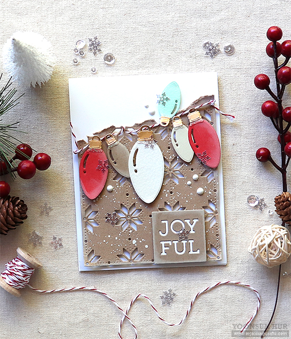 I die cut the Joyful Frame from white cardstock, and then adhered all elements as shown in the picture onto kraft card base using foam tape.
