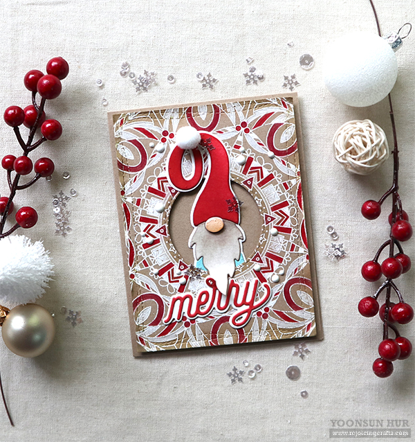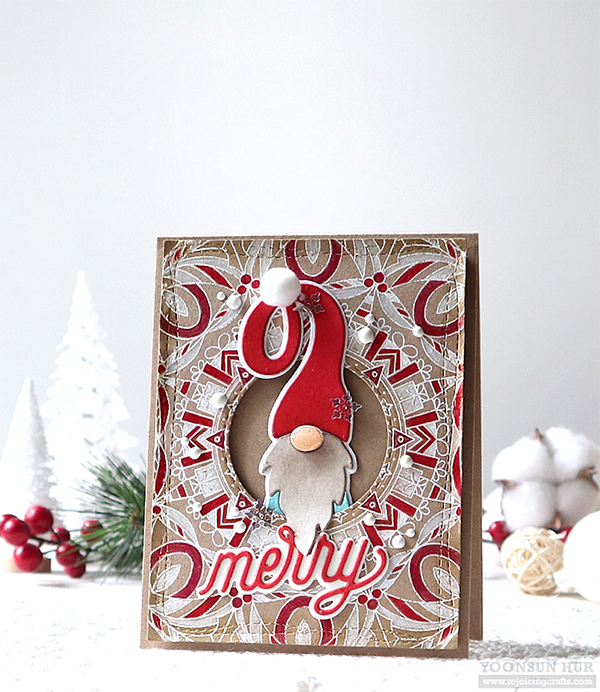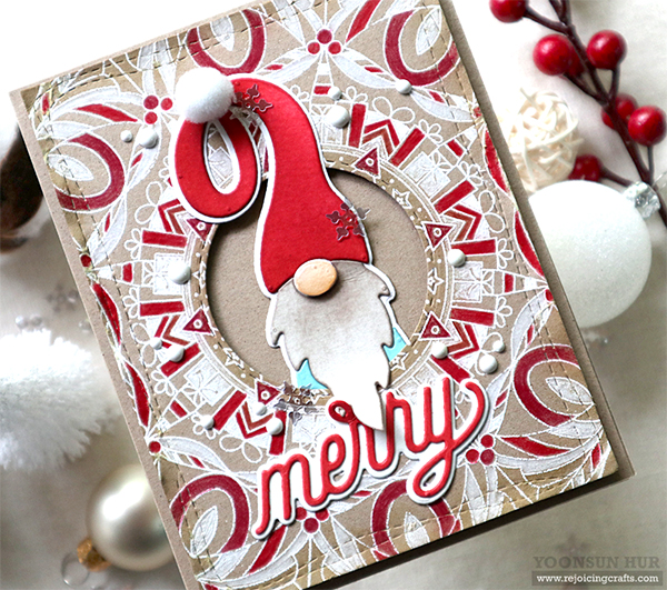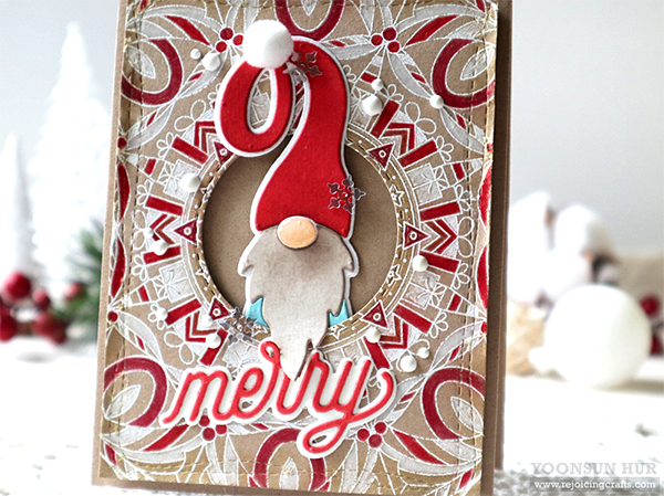 For my first card, I used the Christmas Kaleidoscope background stamp along with the Gnome die. I die cut the 4 x 5.25″ Wonky Rectangle panel from kraft cardstock first, and then heat embossed the Christmas Kaleidoscope Background in white onto the kraft panel. For colouring the stamped background, I just used white & red polychromos colored pencils – I love white, red and kraft colour combo!! I cut the centre of the background panel using the Stitched Circles die set.