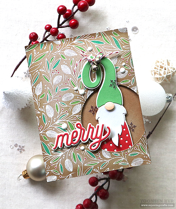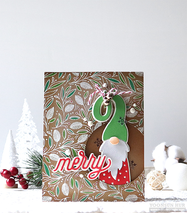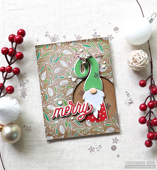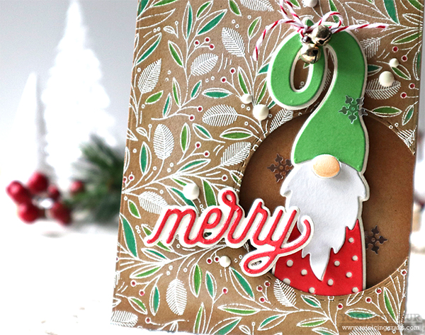 For my second card, I used the Leaves and Berries background stamp along with the Gnome die. I heat embossed the background image in white onto kraft paper panel, and then coloured it with red & green polychromos colored pencils.