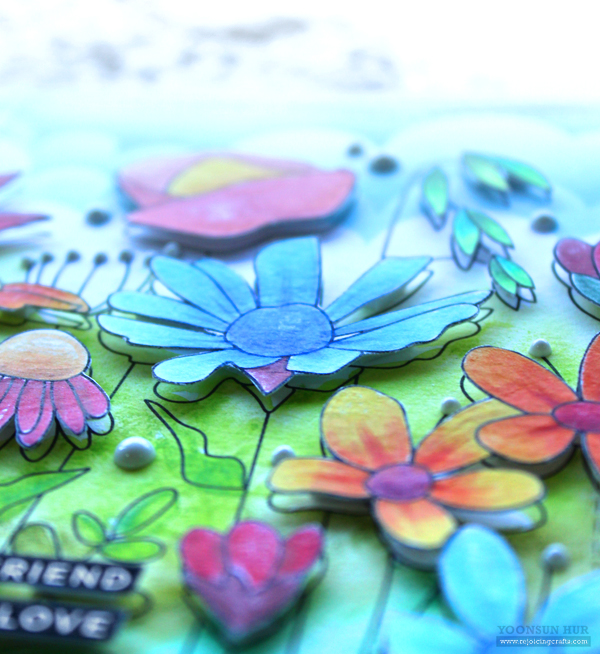 I stamped another set of wildflowers in black, coloured all flowers with polychromos colored pencils, then fussy cut them out. I mounted the panel on kraft card base using double-sided tape first, and then added flowers on the right place using foam tape.