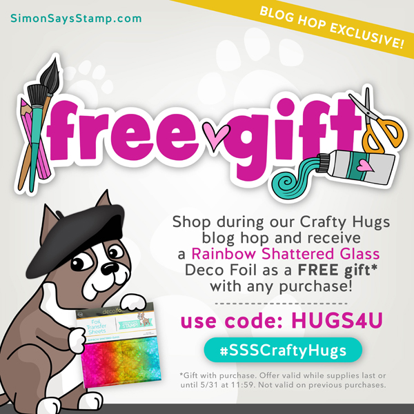 Simon Says Stamp is giving away a $25 coupon to every stop on the hop. The winners will be chosen over the weekend and post on Simon Says Stamp blog on Wednesday, the 3rd of June. ONE MORE! Get a FREE Rainbow Shattered Glass Deco Foil with the code HUGS4U (while supplies last!) at checkout when you purchase at Simon Says Stamp Store.