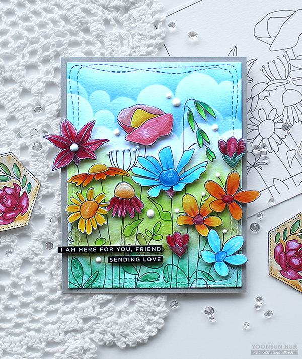 I stamped another set of wildflowers in black, coloured all flowers with polychromos colored pencils, then fussy cut them out. I mounted the panel on kraft card base using double-sided tape first, and then added flowers on the right place using foam tape.