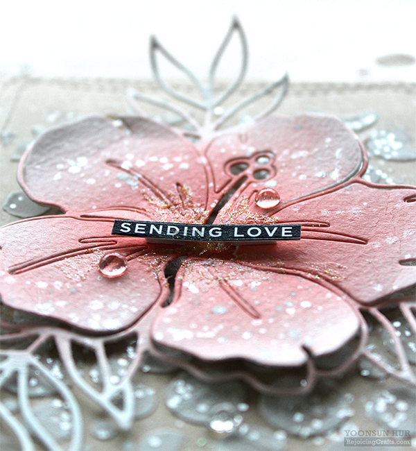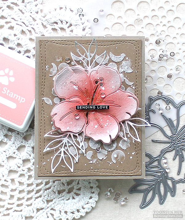 For the background, I applied white embossing paste through the In The Round stencil at the centre of the Wonky Rectangle paper panel. I added opaque white ink splatters here and there. I mounted the background panel on kraft card base using double-sided tape first, and then added pink Hibiscus Bloom using foam tape. For the sentiment, I used the Sentiment Strips Reverse Sympathy.