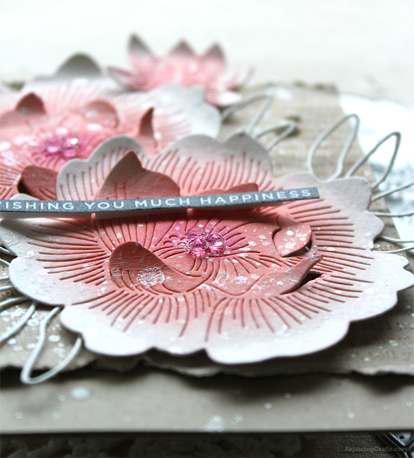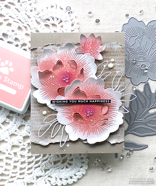 For my second card, I made the same way but used different flower dies – Etched Peony Blossom & Etched Flower Buds dies. For the background, I stamped Thank You Text Background on kraft paper panel using Rusty Hinge Distress ink, then tore the top and bottom of the paper with my hands. I love this vintage look. :D