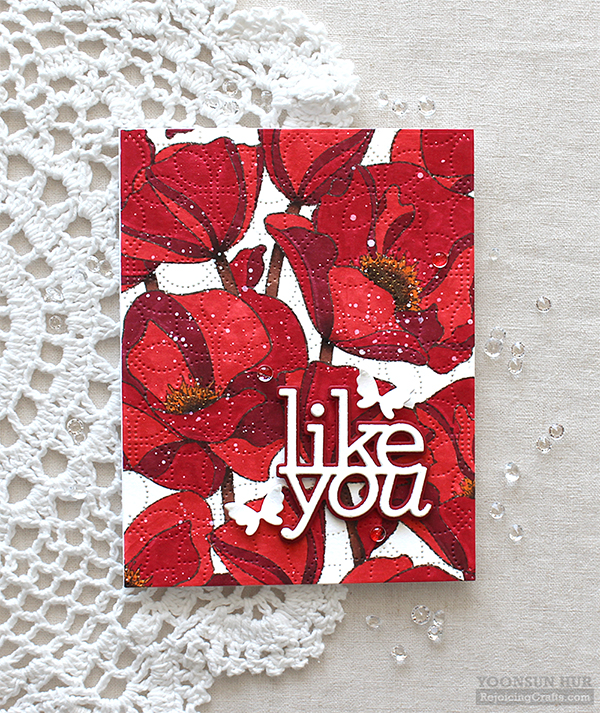 For the sentiment, I die cut the word “Like You” from white cardstock, shadow from Lipstick Red cardstock, then glue together. I die cut tiny butterflies from white cardstock using the Flickering Butterflies die as well. I mounted the floral panel on A2 sized white card base using double-sided tape first, and then added all elements as shown in the picture using foam tape.