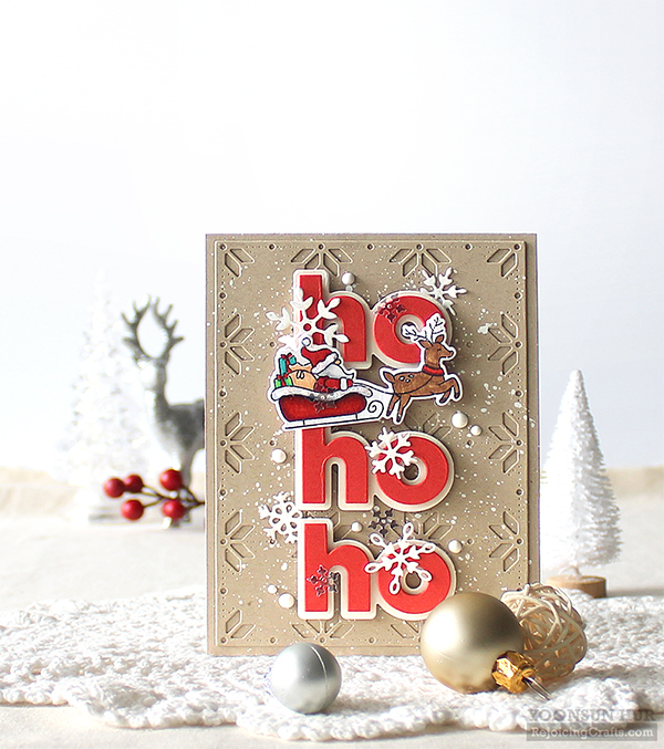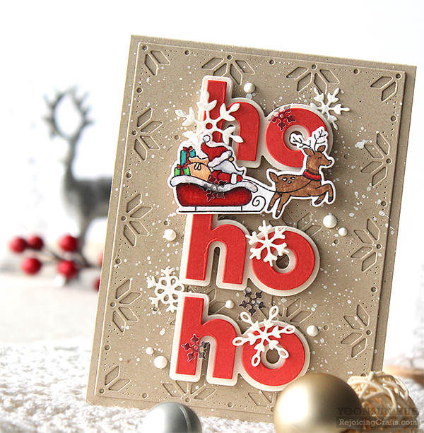 I started by stamping a cute image from the Santa’s Sleigh Ride Slider set onto white cardstock using Memento Tuxedo Black dye ink, coloured it with Copic markers, and then die cut it with the matching die. I then die cut the word “ho” from Lipstick Red cardstock & shadow from white cardstock three times, assembled together each “ho” word using fine tip glue pen. I die cut tiny snowflakes from white cardstock using the Stitched Flakes die as well.