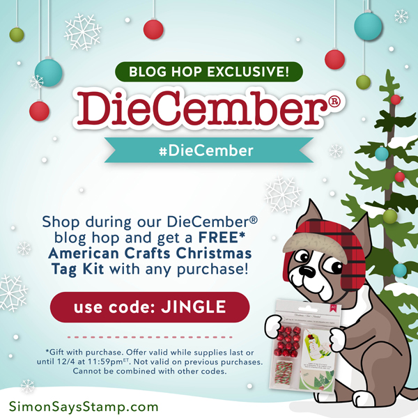 Simon Says Stamp is giving away a $25 coupon to every stop on the hop. The winners will be chosen over the weekend and post on Simon Says Stamp blog on Wednesday, the 9th of December. ONE MORE! Get a FREE American Crafts Christmas Tag Kit with the code JINGLE (This promotion will expire 12/4 at 11:59 pm EST) at checkout when you purchase at Simon Says Stamp Store.