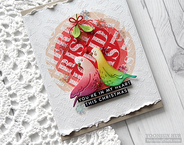 For my first card, I used the Turtle Doves die set as my main supply. Oh, isn’t this couple so lovely?!! I die cut the turtle doves from watercolour paper first, and then ink blended them with several Distress inks. I also die cut mistletoe from green apple cardstock, ribbon & tiny hearts from lipstick red cardstock. I used glitter gold cardstock for beaks because it’s Christmas, lol!