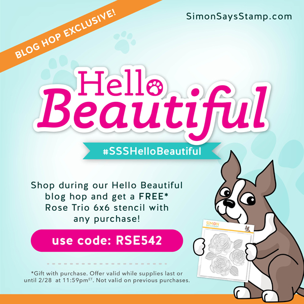 Simon Says Stamp is giving away a $25 coupon to every stop on the hop. The winners will be chosen over the weekend and post on Simon Says Stamp blog on Wednesday, the 3rd of March. ONE MORE! Get a FREE Rose Trio Stencil with the code RSE542 (This promotion will expire 2/28 at 11:59 pm EST) at checkout when you purchase at Simon Says Stamp Store.
