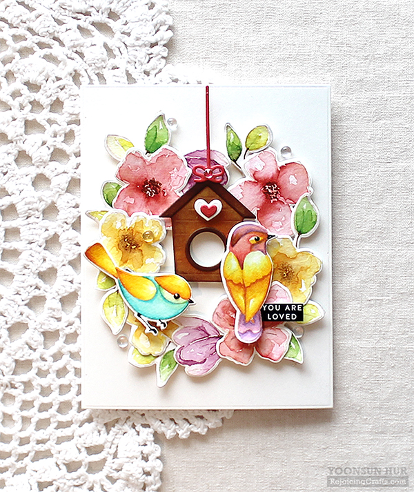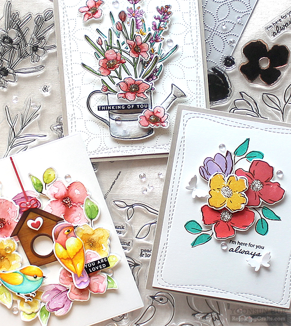 As you can see, Simon’s exclusive Hello Beautiful products seem to give me spring as a gift! Beautiful flowers bloomed in my craft room, haha! For my first two floral cards, I used the beautiful Blooming Meadow set along with the Spring Birds and the Bitty Birdhouse set.