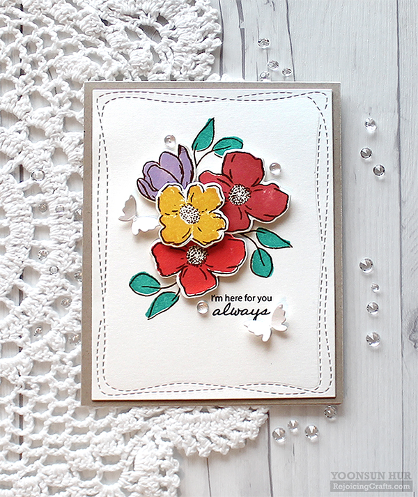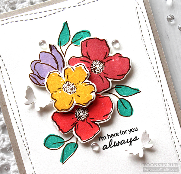 For this CAS floral card, I simply stamped flower petals & leaves from the Blooming Meadow set using several SSS dye inks – I used Lipstick Red & Rose Apple dye inks for red flowers, Lavender for purple flower, Clementine for yellow flower and Scuba for leaves. I stamped outlines with Gathered Twigs Distress ink. I then stamped the sentiment in Onyx Black, added tiny butterflies around the flowers.