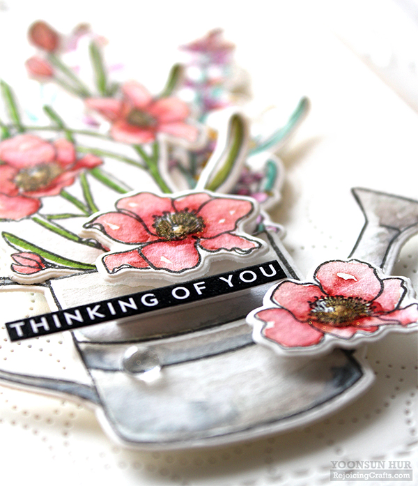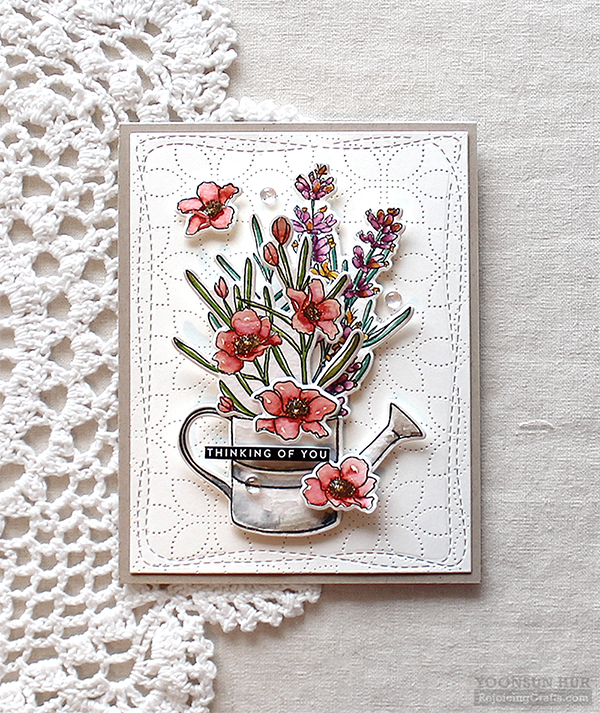 For my last card for the hop, I used the Lavender Garden set. I stamped flowers & watering can onto watercolour paper using VersaFine Onyx Black, then watercoloured them with Distress inks.