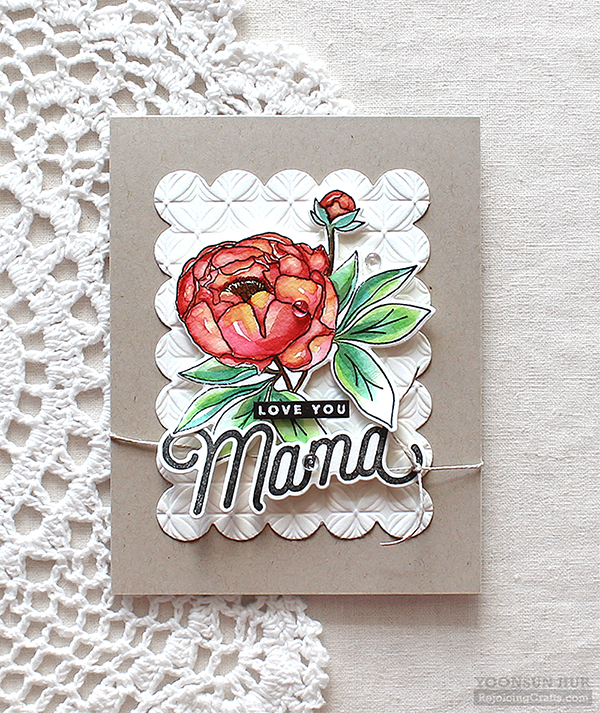 I stamped flower image on watercolour paper using VersaFine Onyx Black first, then coloured the stamped image with some Distress inks. For flower petals, I used Festive Berries, Fired Brick and a little bit of Scattered Straw. For leaves, I used Mowed Lawn, Crushed Olive and Peeled Paint. Once the watercoloured image was dry, I die cut it with the matching die. For the sentiment, I stamped “Mama” from the CZ Design Love You Mama set on white cardstock using VersaFine Onyx Black, and then die cut it out. I heat embossed the word “LOVE YOU” on black cardstock in white as well. For the background panel, I die cut Chunky Scalloped Rectangle panel from thick white cardstock, dry embossed it with Lumen Embossing Folder. Finally I mounted scalloped rectangle panel on Neenah Desert Storm card base using double-sided tape first, and then added all elements as shown in the picture using foam tape.