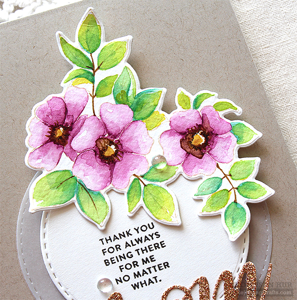 For my last card today, I made a no-line watercolour card. I stamped flower image on watercolour paper using Altenew Sand Dunes dye ink first, coloured it with some Distress inks, then die cut it out. For the sentiment, I used the Mom Word Mix 2 stamp set & the Script Mom die.