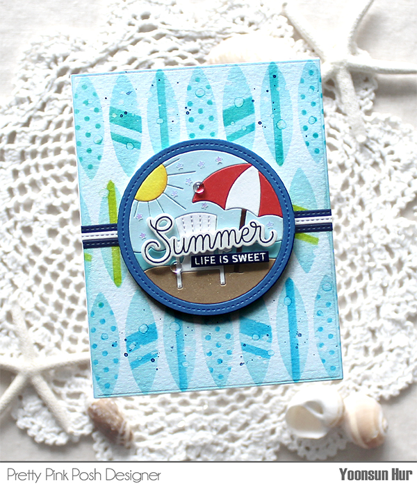 Love the stenciled surfboard background. It is so pretty. The drops of water you splashed on it make it look wet. Both cards make me want to go to the beach ⛱.