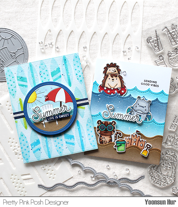 Wonderful summer cards! I love the soft watercoloured surf boards on the background of your first card!! So pretty! Thanks for the great inspiration! Stay safe! :)