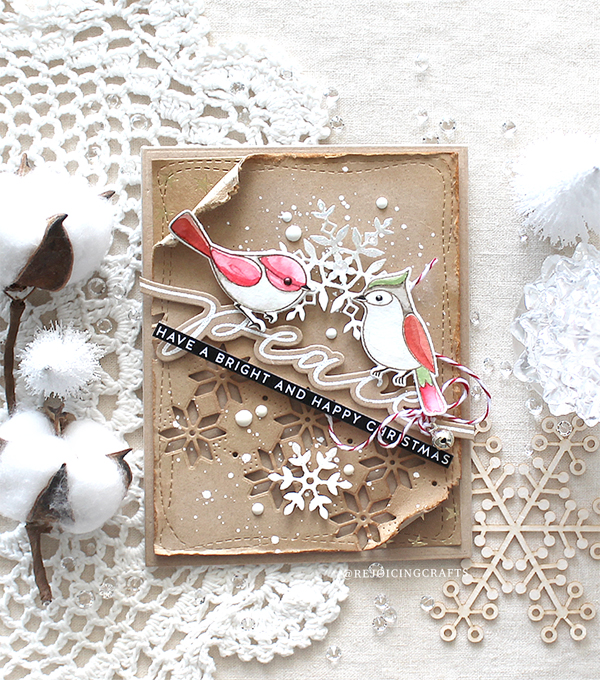 For my second kraft Christmas card, I die cut diagonally the Holiday Knit Border at the bottom part of the kraft panel. I then used the word “Peace” in the Holiday Sparkle Greetings stamp set, added two adorable birds & snowflakes.