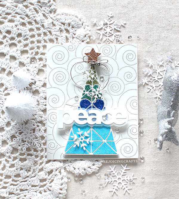 To decorate the Geometric Christmas Tree, I die cut tiny snowflakes from white cardstock using the Stitched Flakes die. For the sentiment, I die cut the word “Peace” from white cardstock, shadow from vellum paper, and then glued them together using fine tip glue pen. I applied the Detail Swirls pattern on A2 sized paper panel, mounted it on white card base using Dot Runner Adhesive, and then added all elements as shown in the picture.