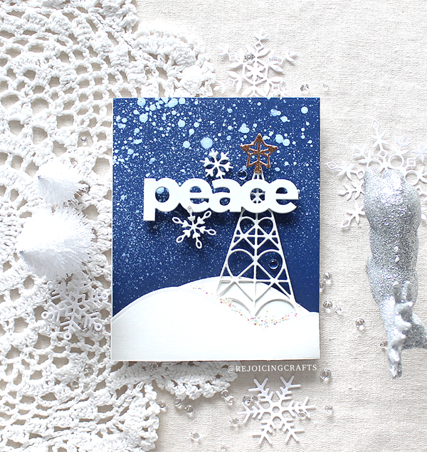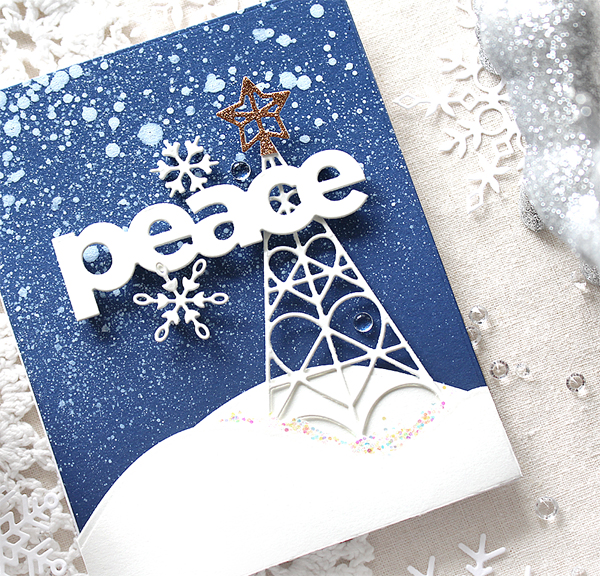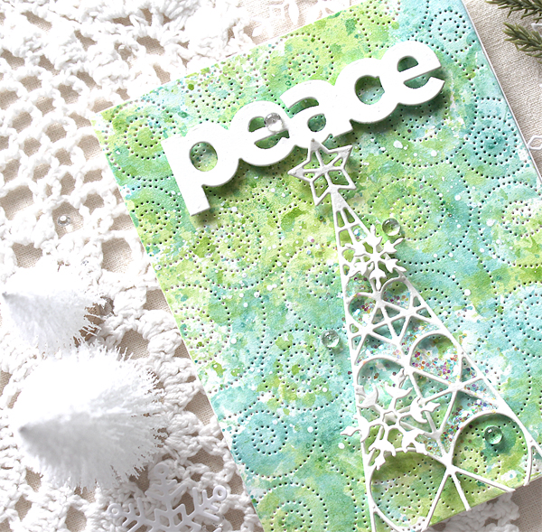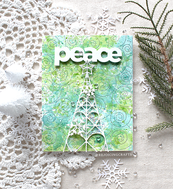 Here is my second “Peace” Christmas card. I die cut the Geometric Christmas Tree, Peace sentiment and tiny snowflakes from white cardstock same as my first card. For my own background, I freely spritzed Altenew Metallic Shimmer Sea Glass & Frayed Leaf ink sprays onto the Detail Swirls pattern panel. I then simply added white tree & sentiment die cuts as shown in the picture.