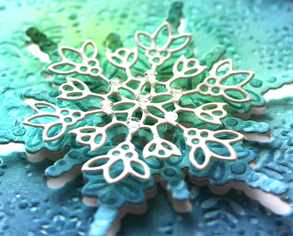I die cut the larger snowflake from the embossed panel with the matching die, and die cut the Daphne Snowflake from thick white cardstock as well. I mounted the panel on white card base using Dot Runner Adhesive first, and then added two snowflakes using foam tape as shown in the picture.