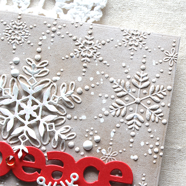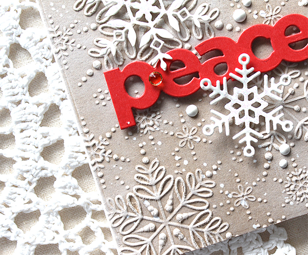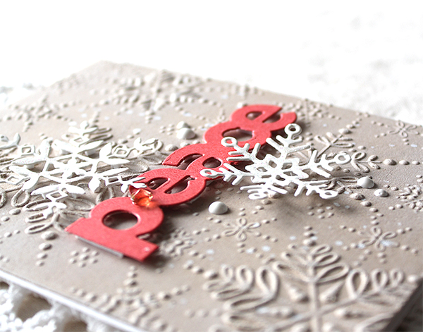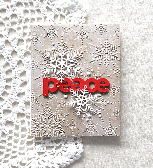 Here is one more card with the Refined Snowflakes embossing folder and die set. I dry embossed onto Neenah Desert Storm paper panel first, and then rubbed on surface of the panel with white pigment ink – I looooove this technique so much!! I die cut snowflakes from thick white cardstock, “peace” sentiment from Lipstick Red cardstock, then adhered them to the centre of the card front using foam tape.