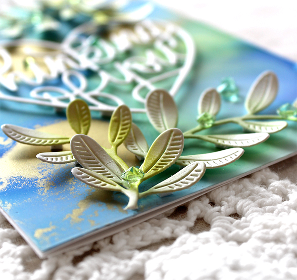 I adhered all watercoloured flowers & leaves, wedding ring on the centre of the white butterfly base using foam tape. I decorated the card with small clear droplets.