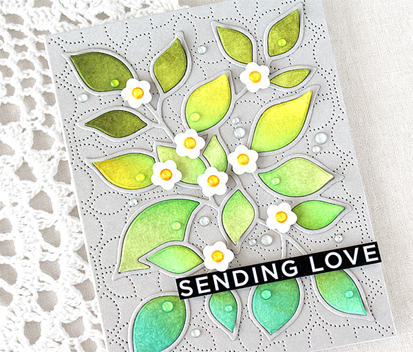For the second butterfly card, I die cut flowers & leaves from watercolour paper using the Hero Arts Envelope Accessorise dies, randomly glued all die cuts on white butterfly card base using fine tip glue pen, and then ink blended it with some Distress inks in rainbow order. I added smaller vellum butterfly die cut, pearls and Hero Arts small butterfly on the card.