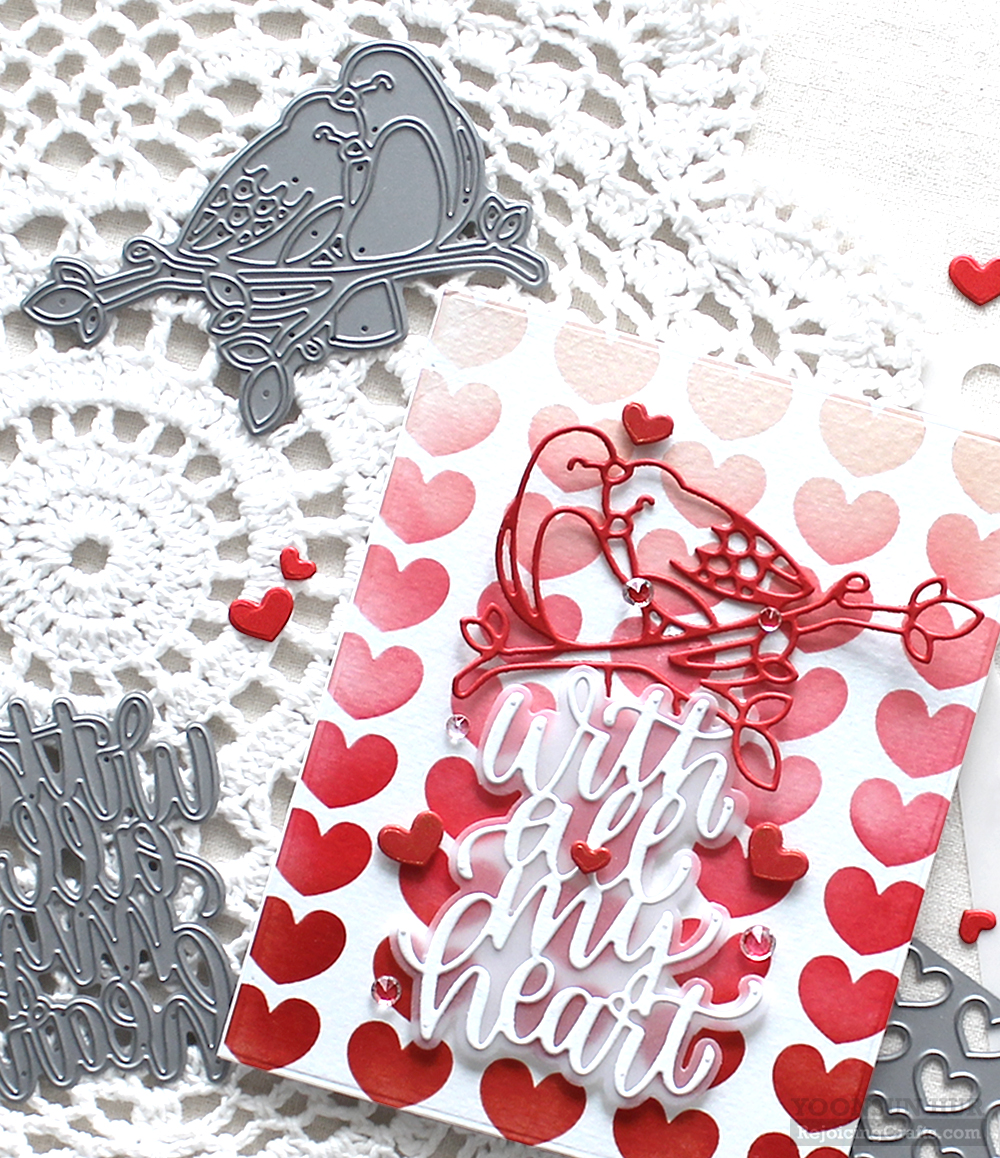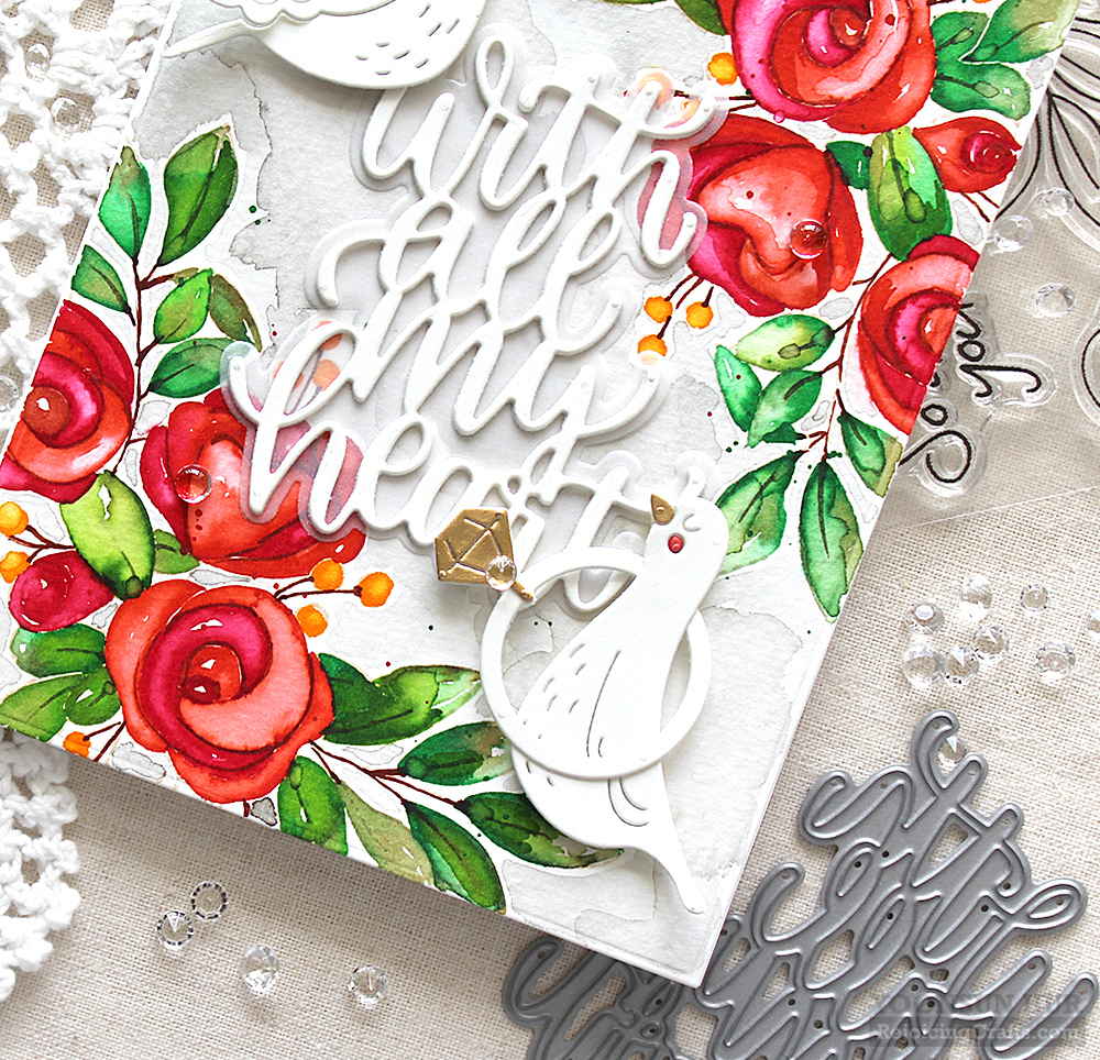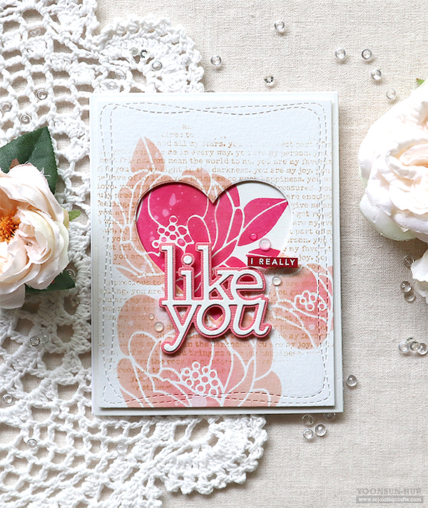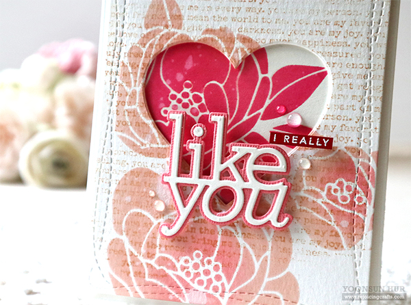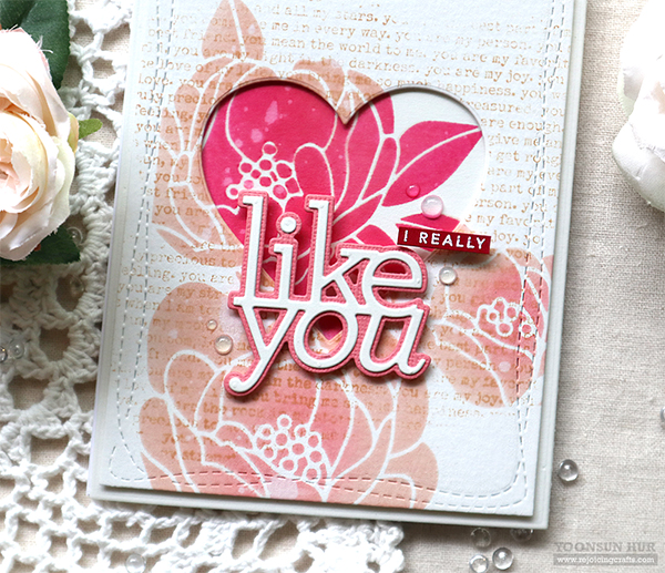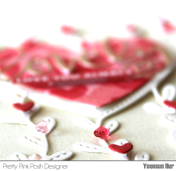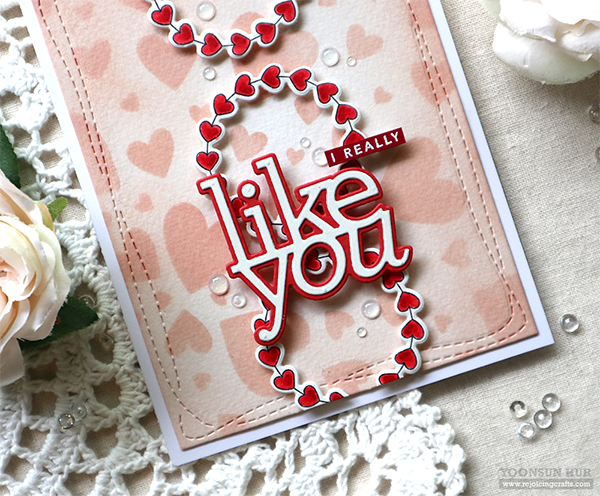 I mounted the pink hearts patterned panel on white card base using double-sided tape first, and then added all elements on the card using form tape. I added water drops using