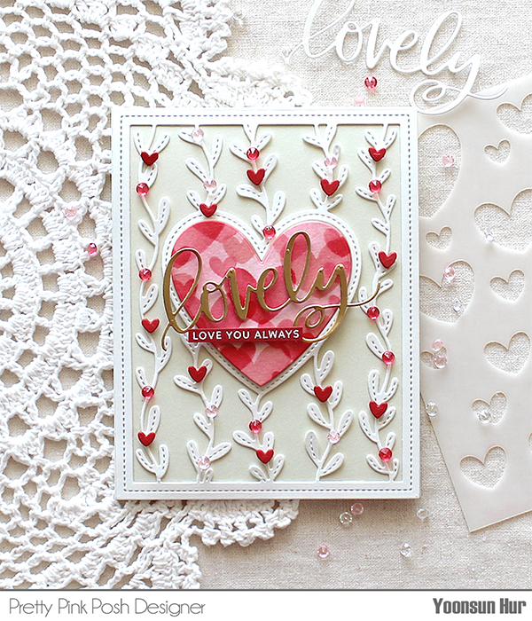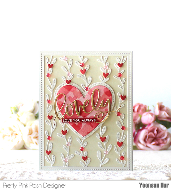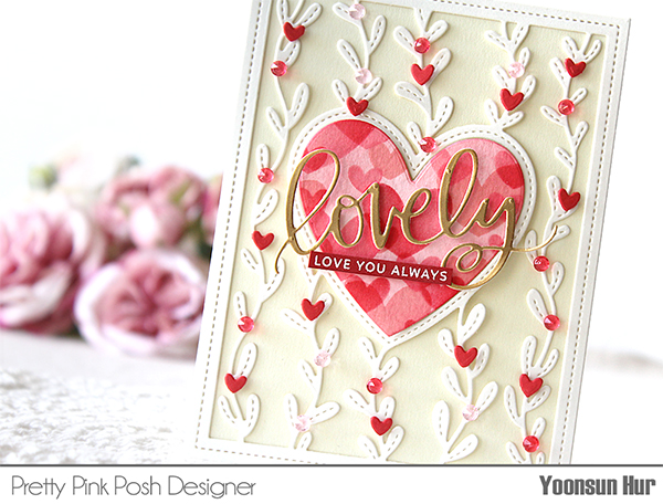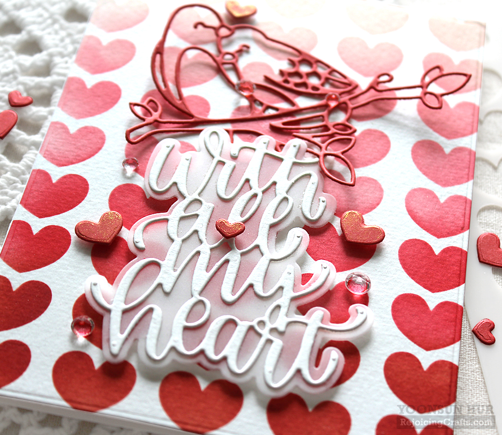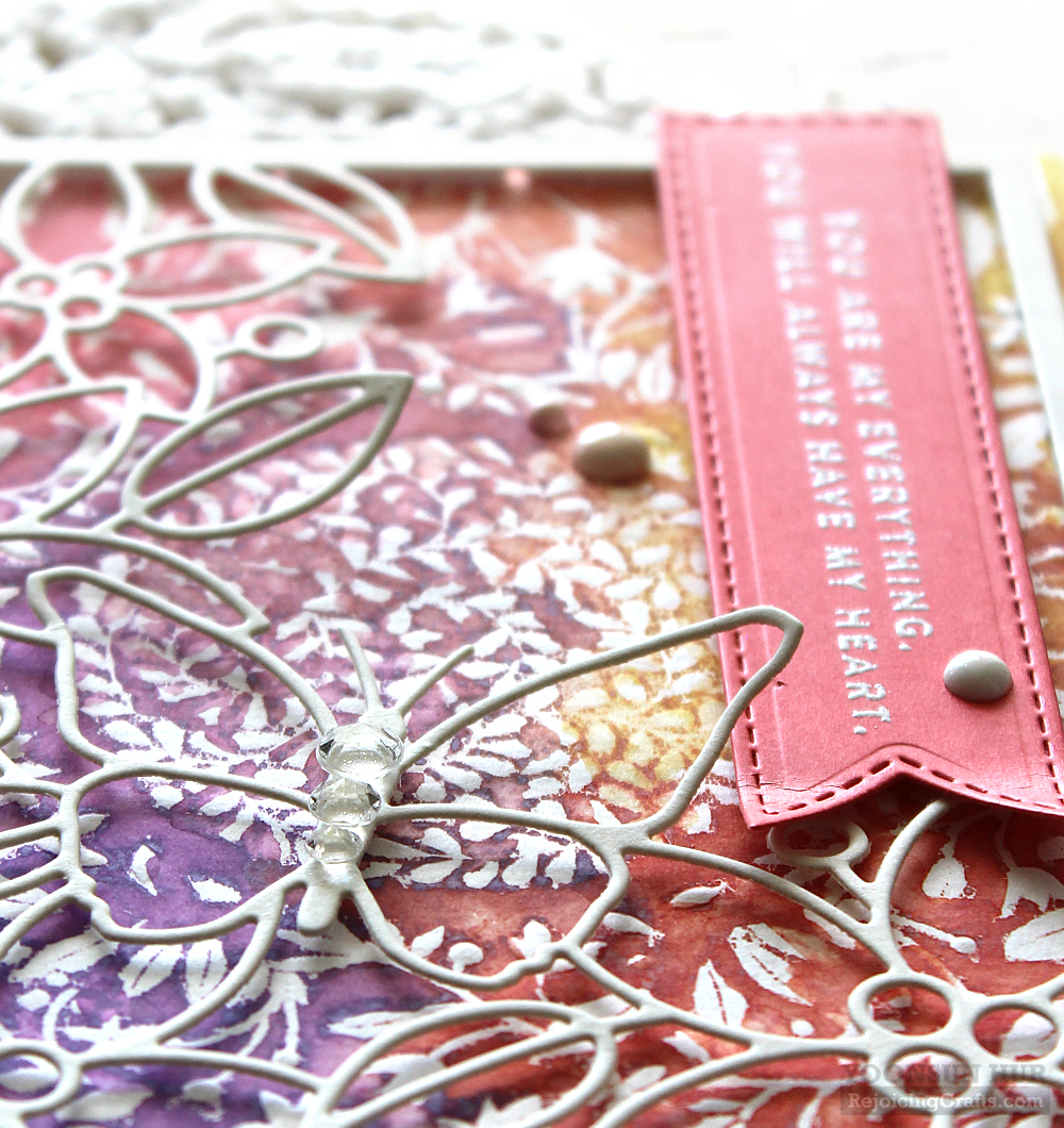 I mounted the pink hearts patterned panel on white card base using double-sided tape first, and then added all elements on the card using form tape. I added water drops using