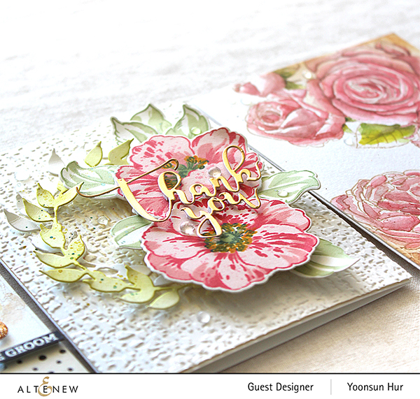 For the sentiment, I die cut the word “Thank you” from metallic gold cardstock using the Flower Arrangement die set.