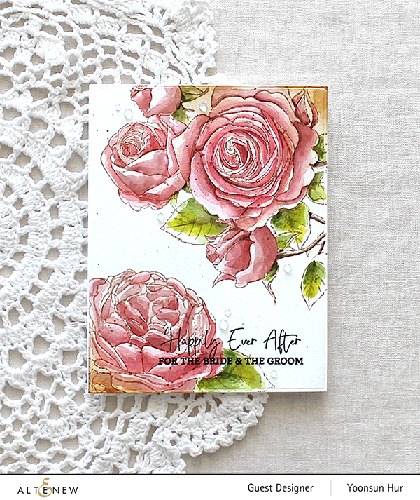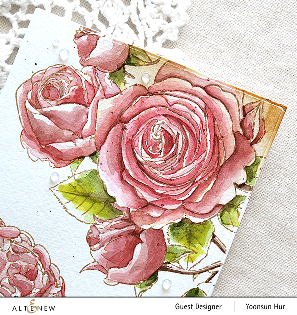 I stamped flower images from the Fresh Cut Roses set onto watercolour paper panel using Rocky Shore dye ink. I then coloured the stamped images using Watercolor 36 pan set: