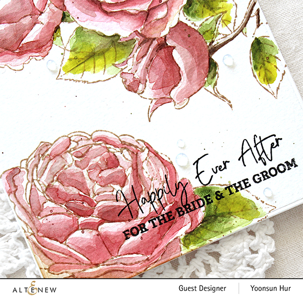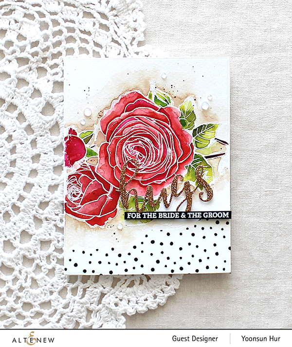 I heat embossed the flower in white first, and then watercoloured it – I used Crimson for petals, Forest Glades & Bamboo for leaves. Red flower and dotted washi tape are the best combination of Altenew floral cards. :D