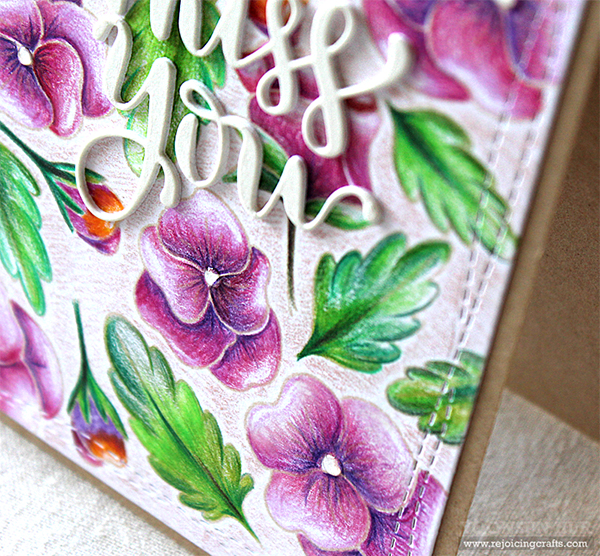For the sentiment, I stamped the sentiment on a stitched circle panel using Walnut Stain distress ink, then heat embossed the edge of sentiment circle panel with gold. I also decorated around the leaves with PPP 4mm Clear Droplets.