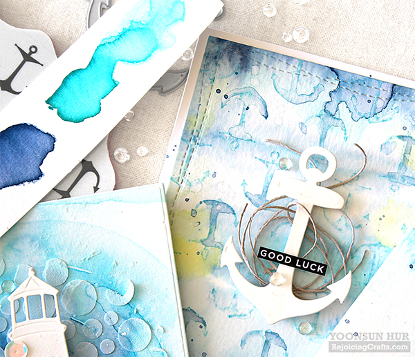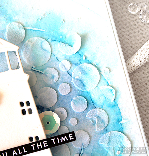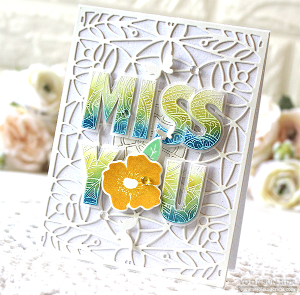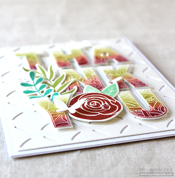 I started by heat embossing the word “THANK YU (except “O”)” from the