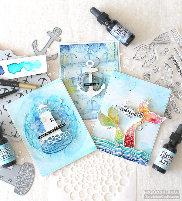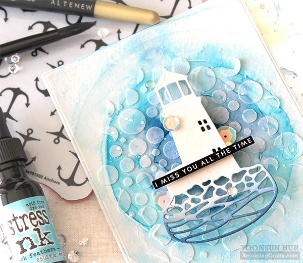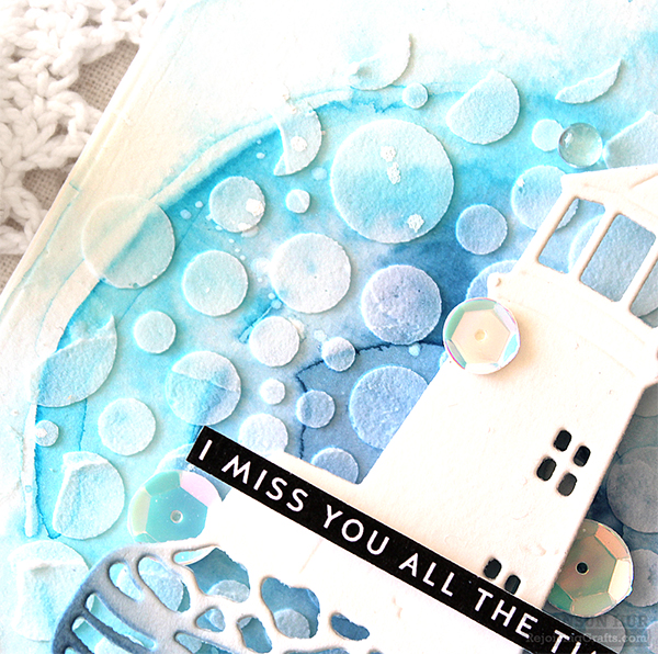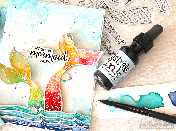 I die cut large leaves from watercolour paper first, then ink blended leaf die cuts with green & blue distress inks. I ink blended the leaf of top-left corner using Bundled Sage & Tea Dye distress inks. For large tropical leaves, I ink blended it with Evergreen Bough, Peacock Feathers and a bit of Pine Needles distress inks. As you know, distress ink reacts with water so, I lightly brushed over the ink with a water brush to lift some of the colour, giving the leaves a watercolour look. I mounted all leaves onto a white card base using foam tape, and then green ink splattered & opaque white ink splattered all over the leafy panel.