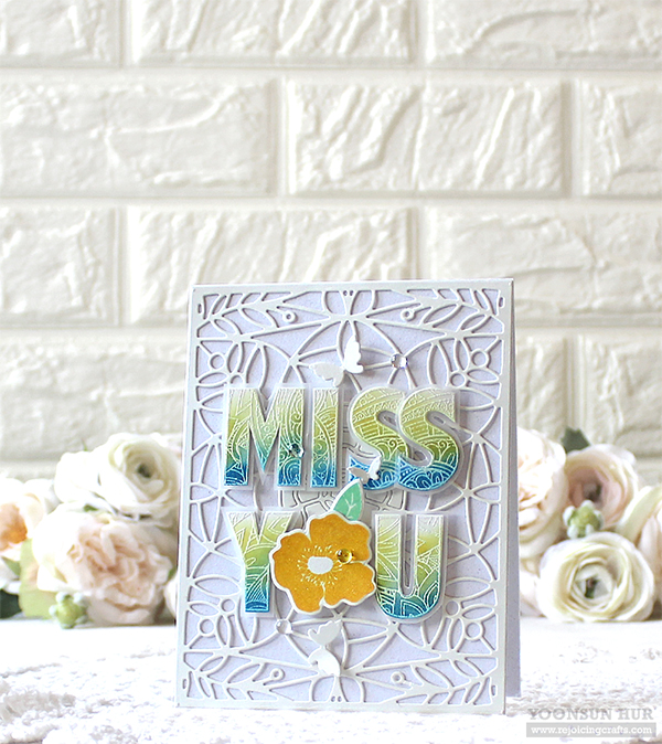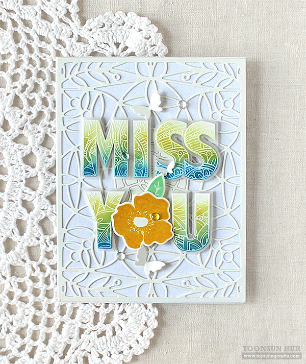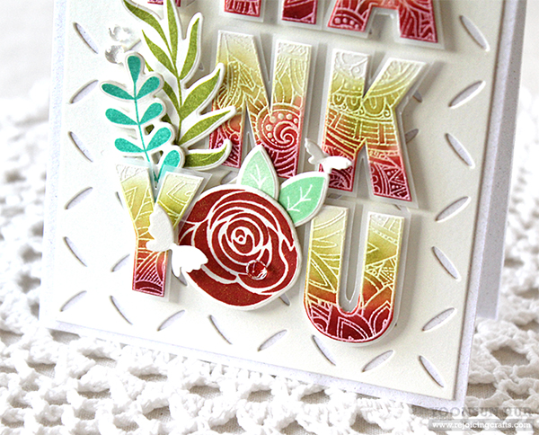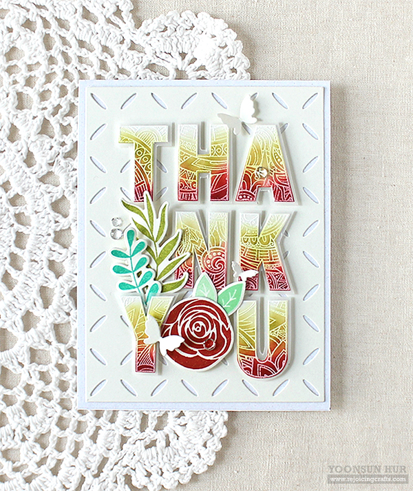 I started by heat embossing the word “THANK YU (except “O”)” from the