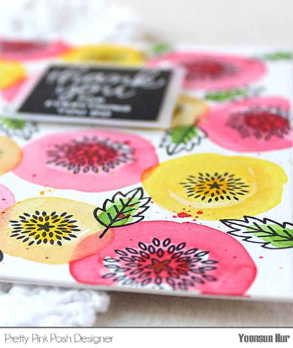 For the sentiment, I used the Thoughtful Greetings stamp set. I heat embossed the “thank you” sentiment on black card stock in white, trimmed it down, and then put it up on the watercoloured floral panel using foam tape.