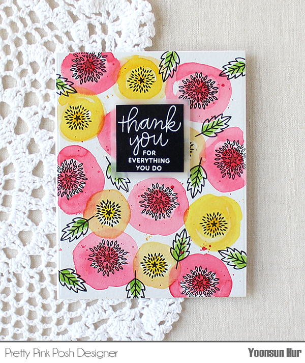 For the sentiment, I used the Thoughtful Greetings stamp set. I heat embossed the “thank you” sentiment on black card stock in white, trimmed it down, and then put it up on the watercoloured floral panel using foam tape.