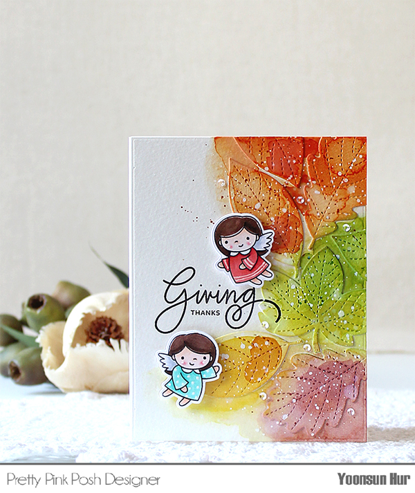 For those adorable angels, I stamped them (from the Angel Friends set) on white card stock using Memento Tuxedo Black dye ink, coloured them with Copic markers, and then die cut them with the matching dies. For the sentiment, I used the Giving Thanks stamp set.
