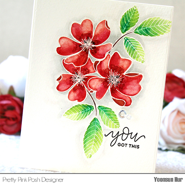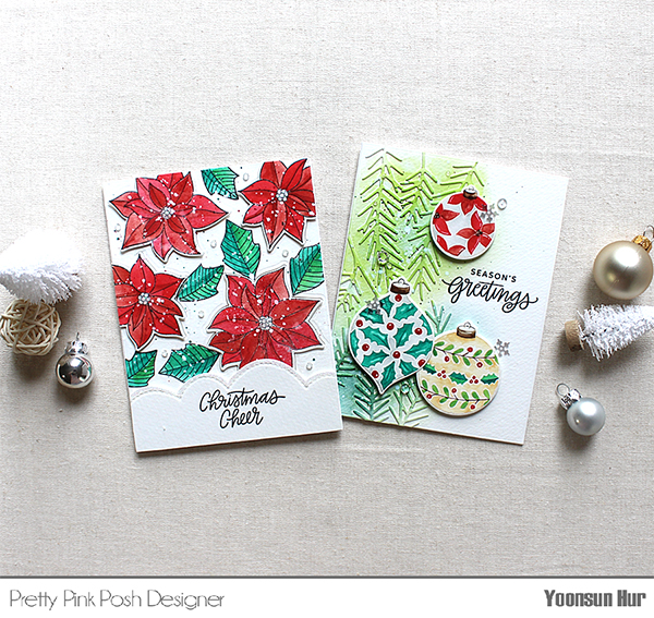 I stamped poinsettias on watercolour panel using black pigment ink, coloured them with watercolours. Once the panel was dry, I die cut poinsettias (not green leaves) with the matching dies, and then adhered back in their original place using foam tape.