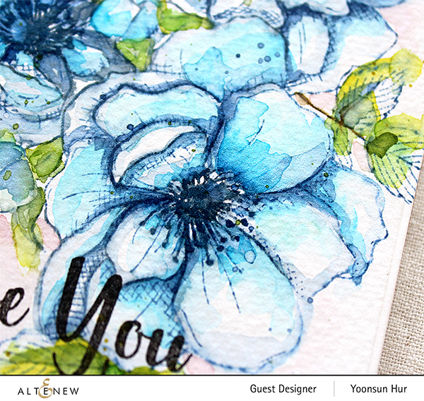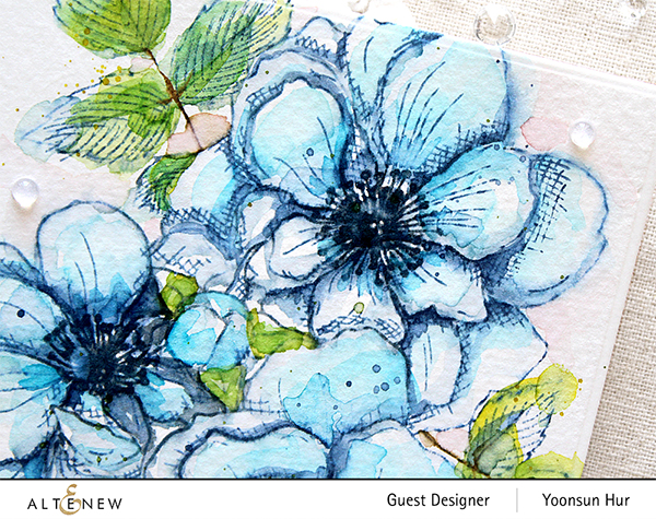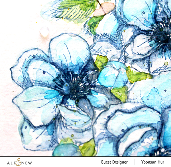 After waiting a moment for the ink to dry completely, I used a wet paintbrush to wash over each flower, softening the colours – I did a water wash over the piece with Seedless Preserves ink applied, then dabbed it with a paper towel to lighten the colour.