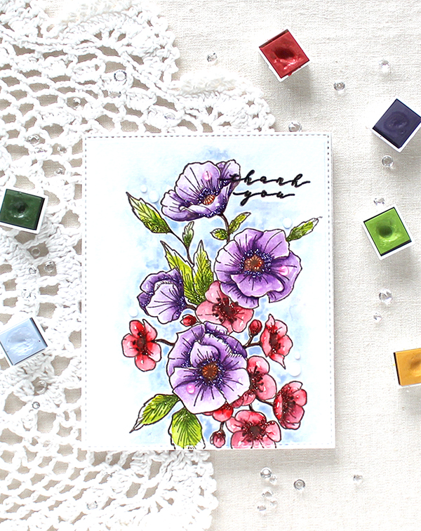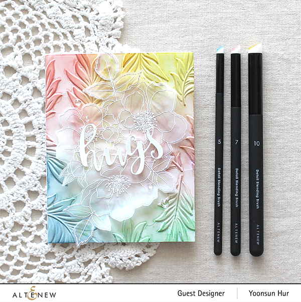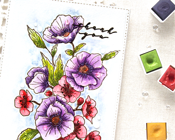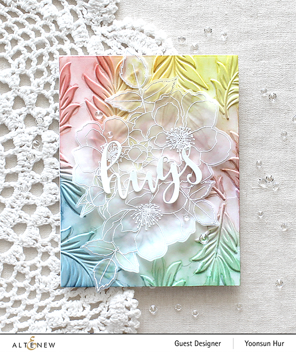 I stamped the pretty flower image onto the top-right & bottom-left corners of an A2 white paper panel using Memento Tuxedo Black dye ink first, then coloured the stamped images with Altenew Acrylic Markers. After colouring, I dry embossed the floral panel with Altenew Diamond Stars 3D embossing folder. For the sentiment, I die cut the “Thanks” from Matte Gold cardstock using Altenew Bold Thanks die set. I decorated the card with Altenew Crystal Clear Gem Sparkles.